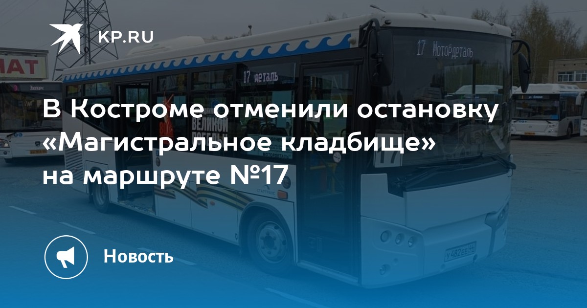 В Костроме отменили остановку «Магистральное кладбище» на маршруте №17. По информации перевозчика отмена является временной. Изменения стали действовать со второй половины дня 10 декабря. Сейчас водители автобусов предупреждают пассажиров об отмене остановки у кладбища заранее на остановочных пунктах микрорайон Паново» и «Стела «Кострома».