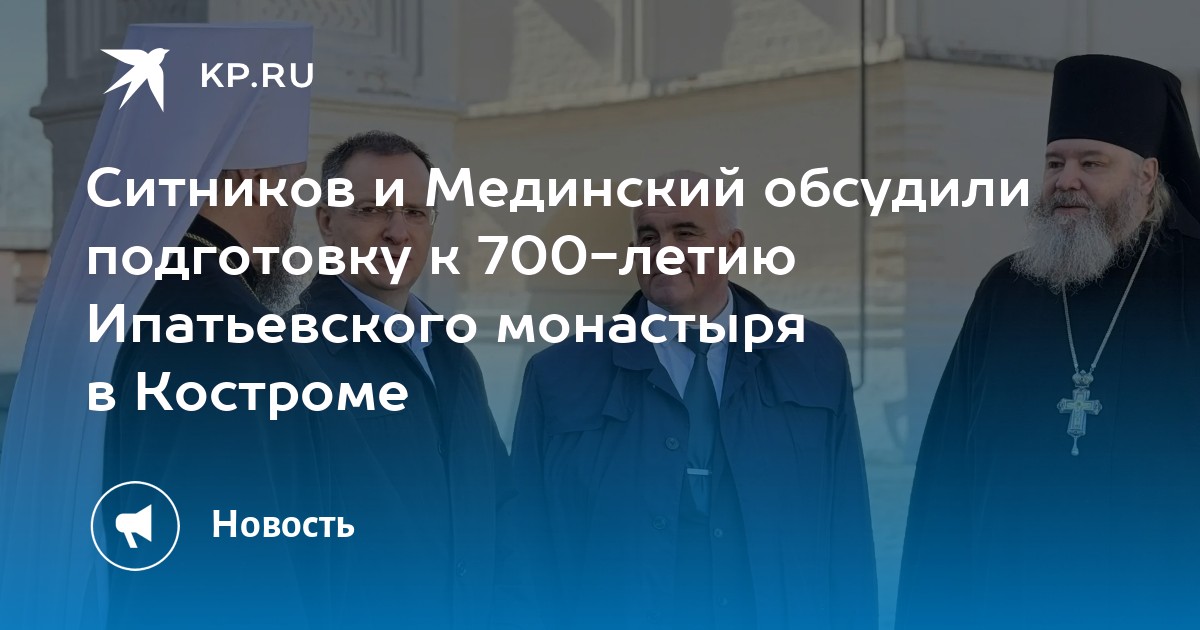 Губернатор Сергей Ситников и помощник президента, первый секретарь Союза писателей России Владимир Мединский встретились в Костроме, чтобы обсудить подготовку к юбилею Свято-Троицкого Ипатьевского монастыря. Обитель — одна из древнейших в России, именно сюда в 1613 году пришла весть об избрании на престол Михаила Романова.