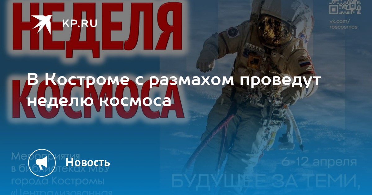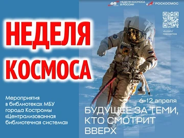 В Костроме стартует всероссийская неделя космоса, приуроченная к 65-летию первого полёта человека в космос. Указ о ежегодном проведении акции подписал президент Владимир Путин. Городские библиотеки и учреждения культуры подготовили насыщенную программу для детей и взрослых.